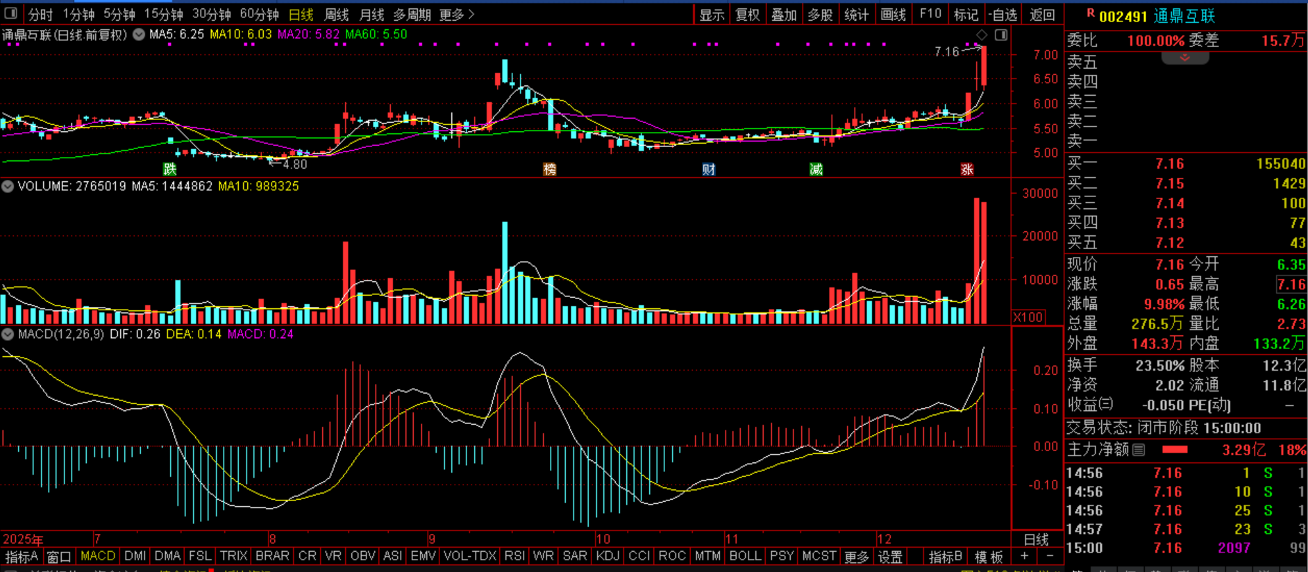 通鼎互联(SZ002491):固态电池+通信线缆+储能消防+光纤光缆+光通信+数字水印+业绩增长。今日该股早盘低开后略一探底就快速拉涨,稳定运行一段时间后就快速封板,量能继续温和放大,这是典型的趋势恢复与强化,后市继续大涨新高的走势,因此笔者强烈看好该股后市。