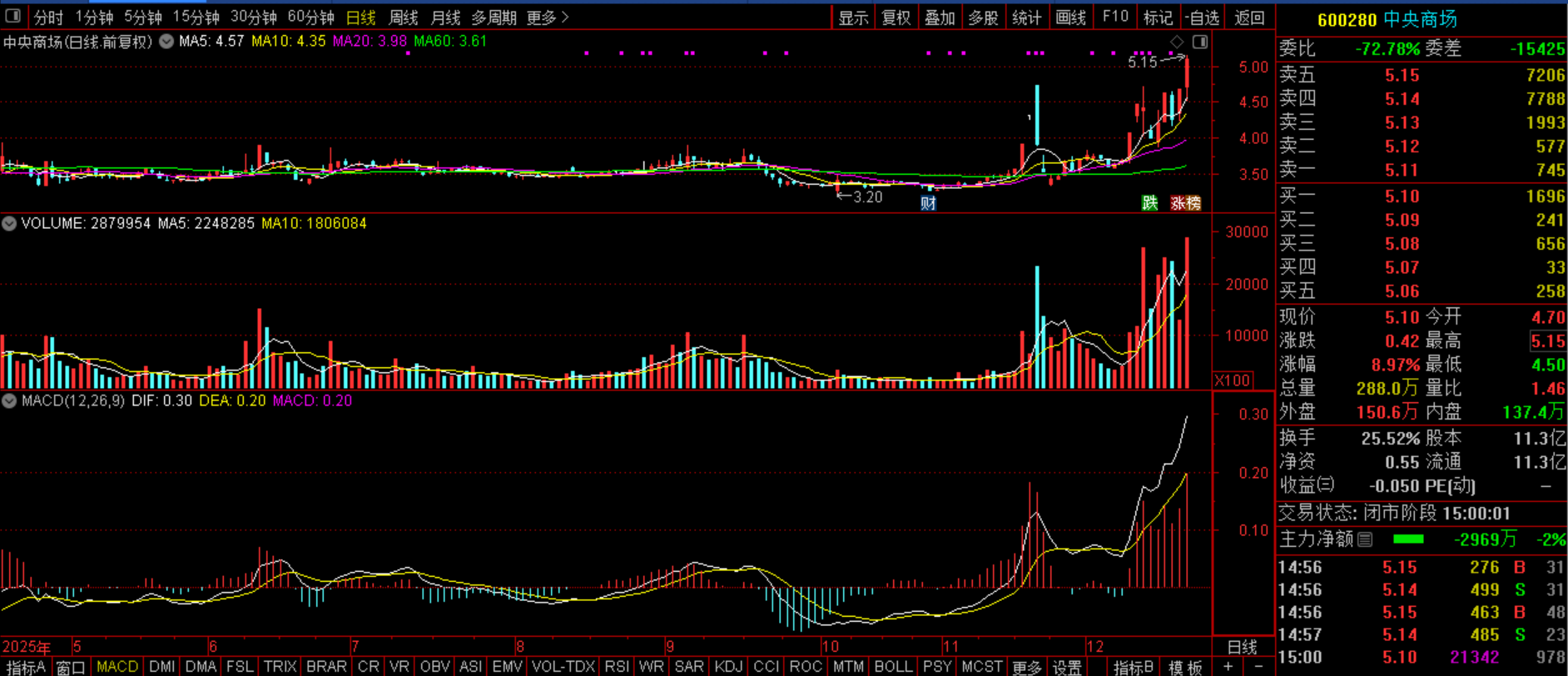 中央商场(SZ600280):百货零售+中华老字号+罗森便利店+政策提振消费。此股开盘就加速探底,不过5日线附近有强力资金迫不及待的强势拉台并快速走高,之后迅速封板,唯一的缺憾是盘中多次炸板,尾市受高位股回落再次炸板,量能创历史,这是典型的大紫金进场的信号,强烈看好后市的表征,料后市该股继续走高甚至快速走涨无忧,如下周有分歧走水的话,仍是机遇,值得继续研究。当然接下来关住的就是5.65突破的情况。