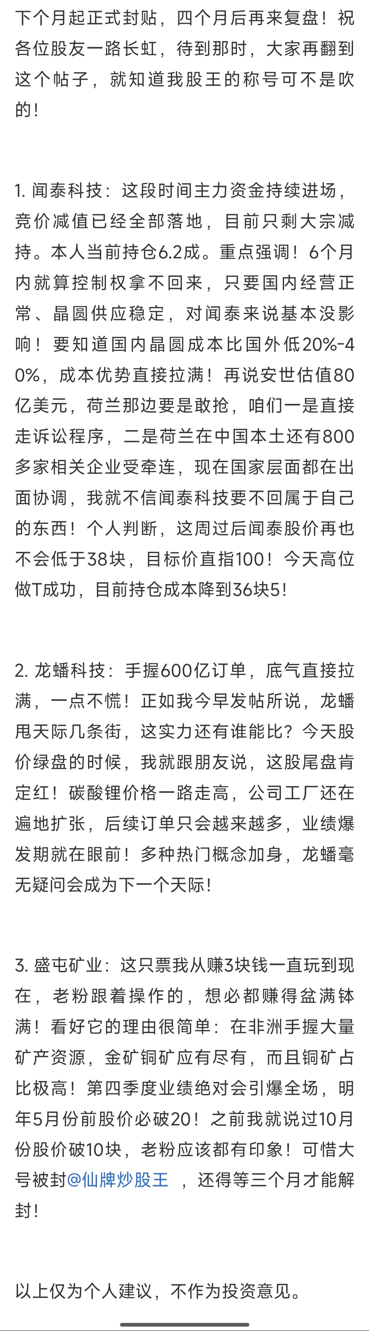 郑重声明:用户在财富号/股吧/博客等社区发表的所有信息(包括但不限于文字、视频、音频、数据及图表)仅代表个人观点,与本网站立场无关,不对您构成任何投资建议,据此操作风险自担。请勿相信代客理财、免费荐股和炒股培训等宣传内容,远离非法证券活动。请勿添加发言用户的手机号码、公众号、微博、微信及QQ等信息,谨防上当受骗!