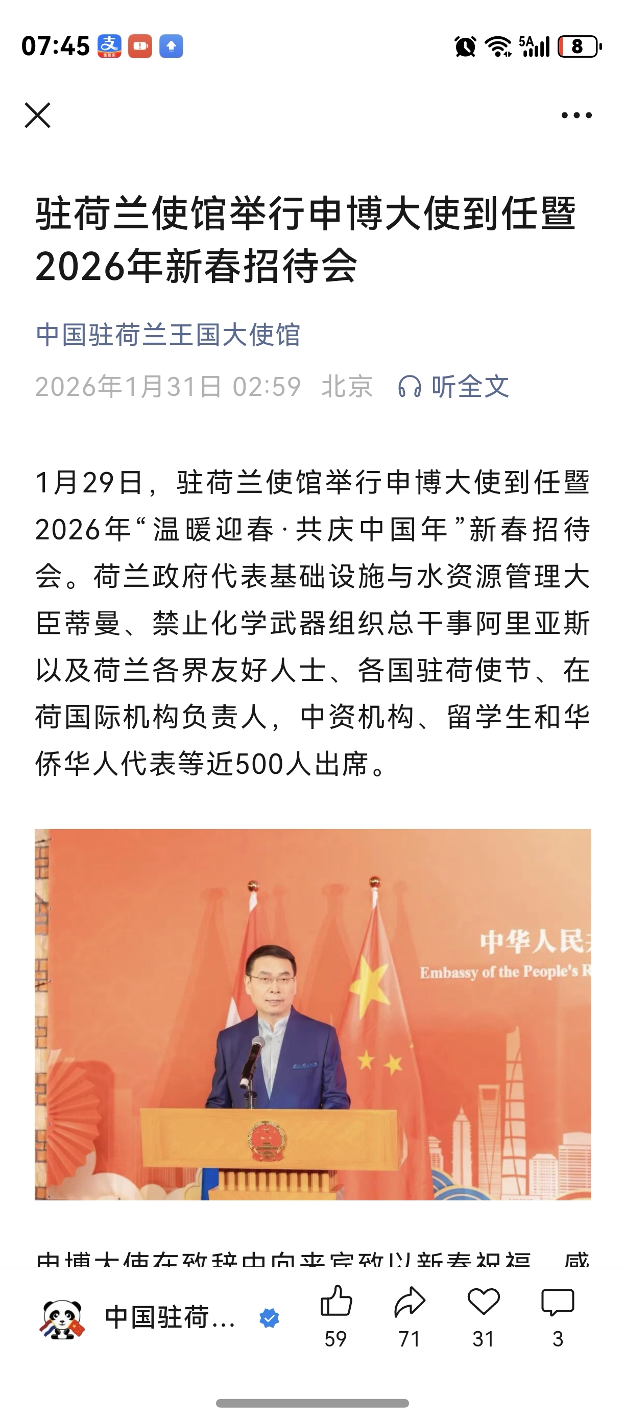 $闻泰科技(SH600745)$ 驻荷兰使馆举行申博大使到任暨2026年新春招待会