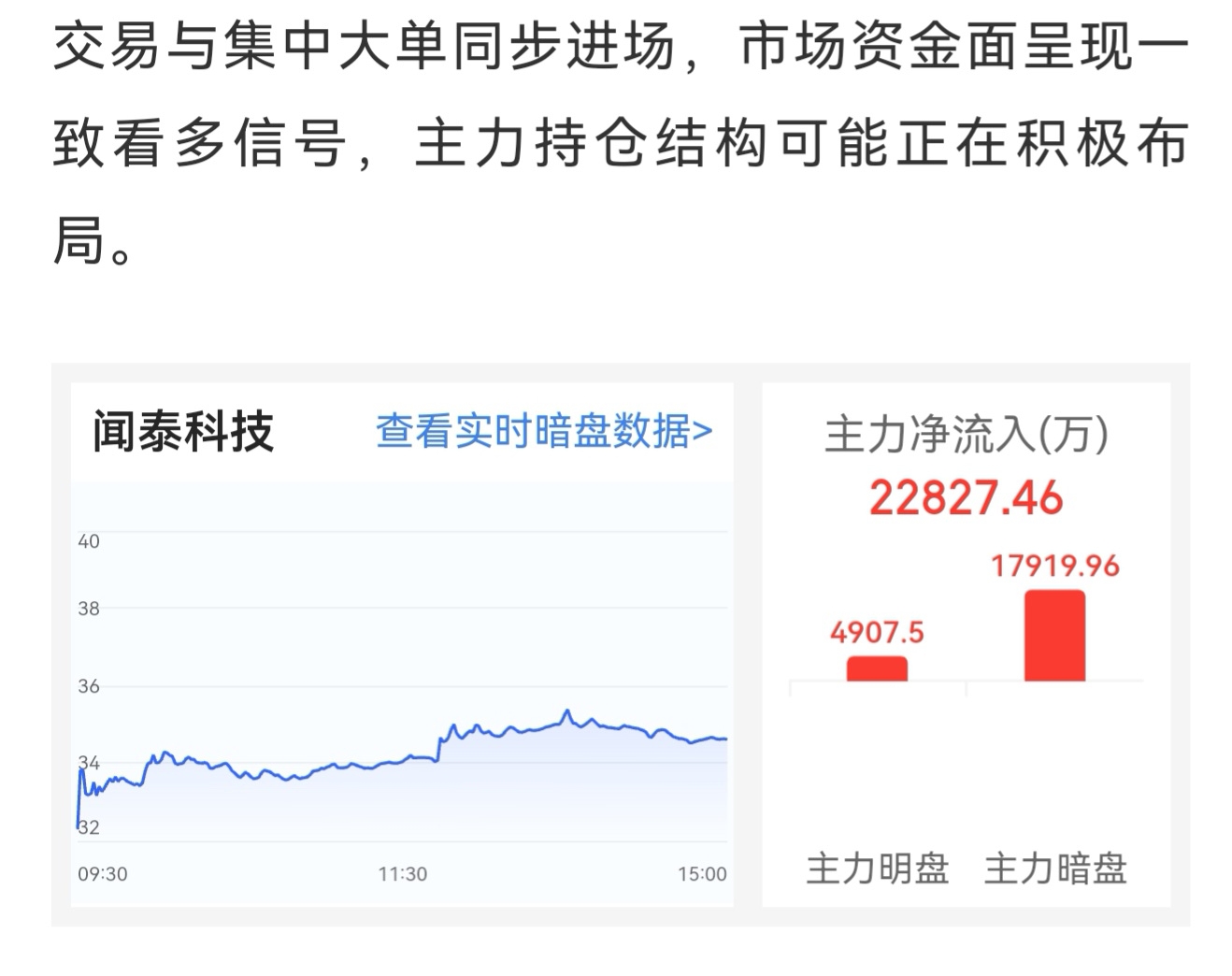 明盘和暗盘资金同时呈现流入状态,且暗盘资金规模显著高于明盘,表明主力资金通过分散交易与集中大单同步进场,市场资金面呈现一致看多信号,主力持仓结构可能正在积极布局。