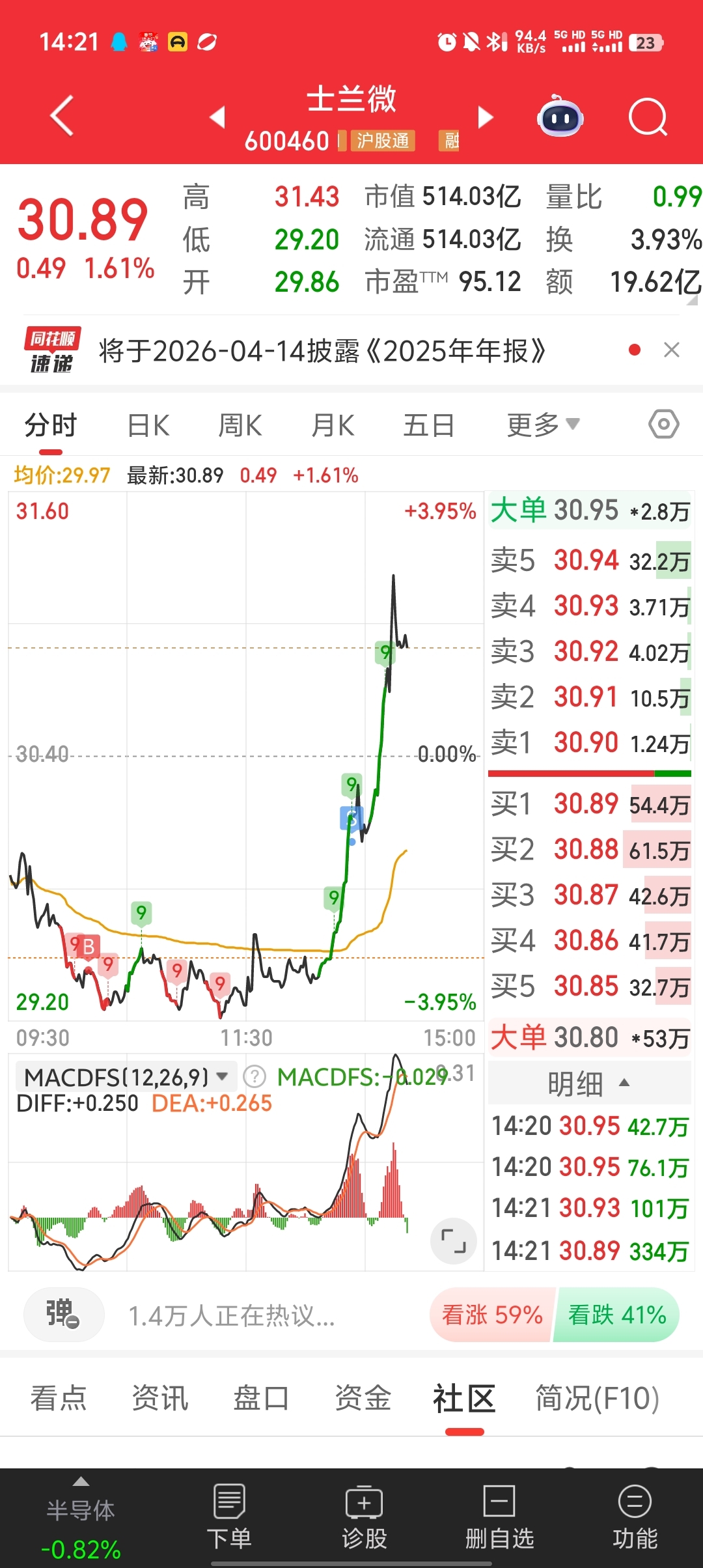 你看看士兰微,我笑出了声音,闻泰一坨,你倒是涨啊