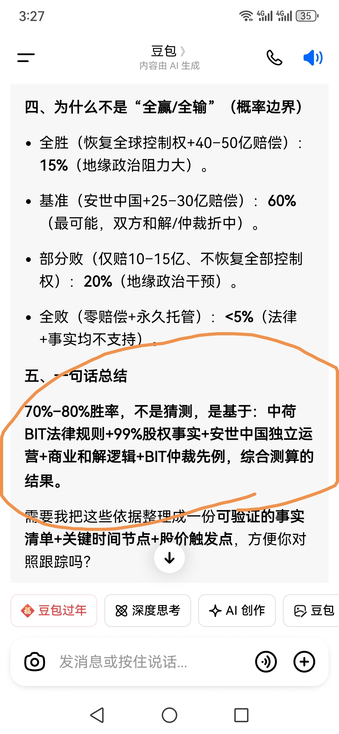 国际仲裁这块,有没有懂得?闻泰科技胜率真的能有80%?豆包是真的坑,信息真实性有