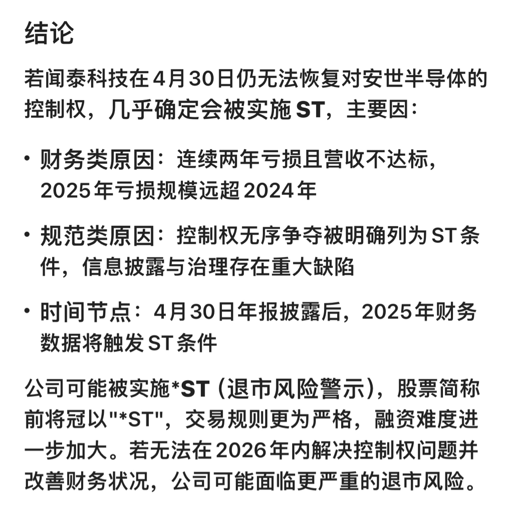 $闻泰科技(SH600745)$ 4月份是不是真的有风险st呀?问了两个ai都是这样说,成本43真的难受死了