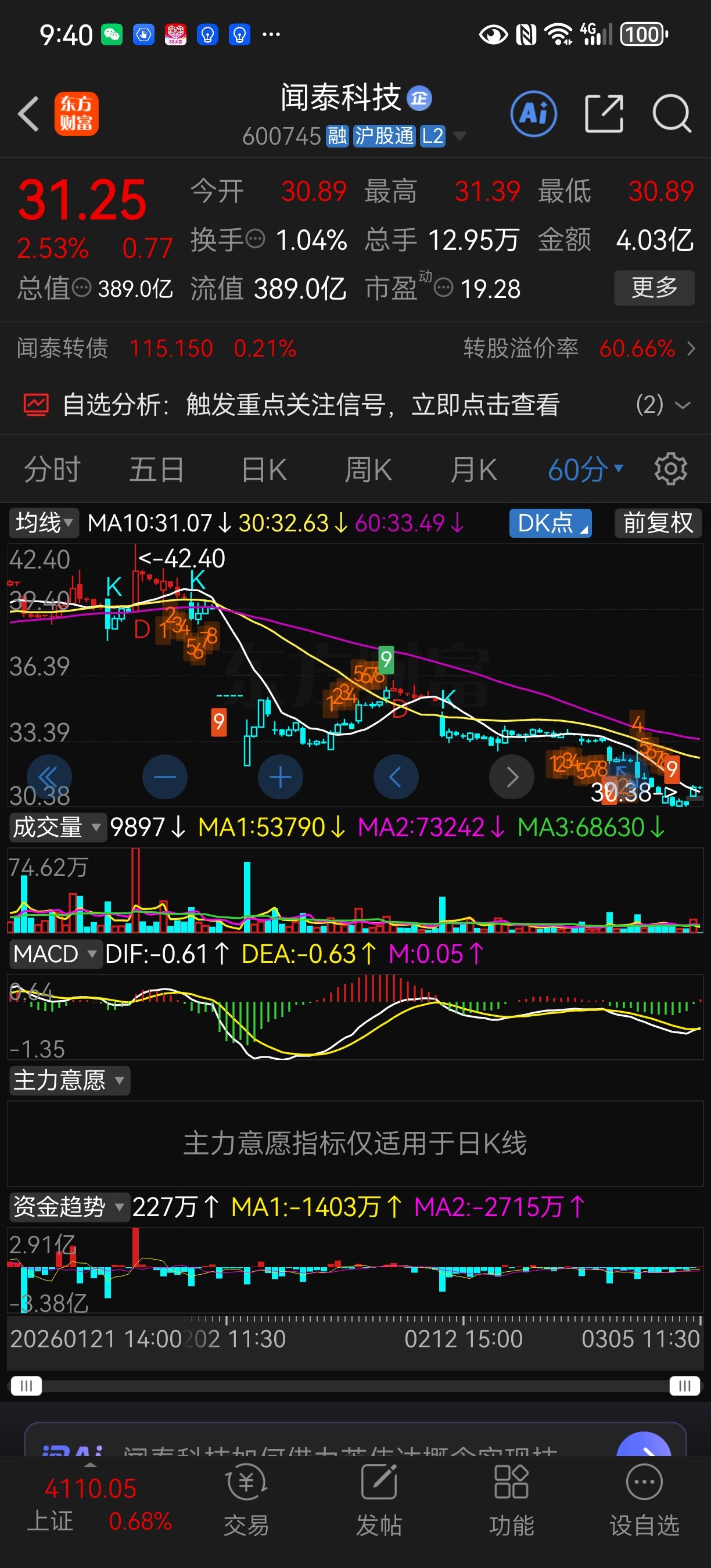 $闻泰科技(SH600745)$ 近一十二个交易日以来今天算是比较强势的了,再接再厉站上三十二块钱心情就会舒服许多,虽然还套许多,能阴转晴就是一个良好的开端。