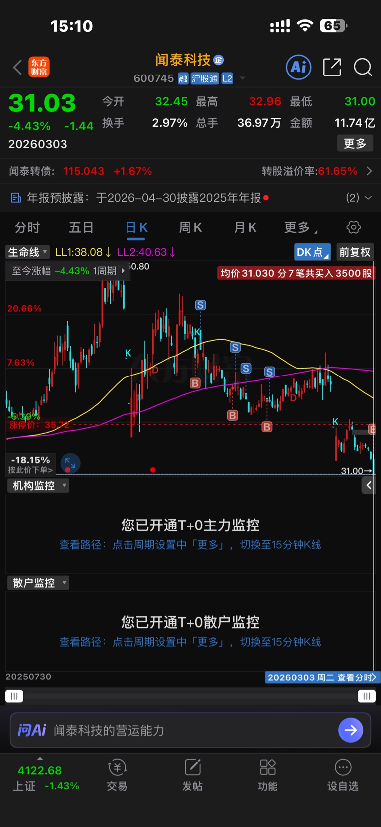 前天31.03买了3500股,昨天30.49又买了7000股,今天准备全部清仓