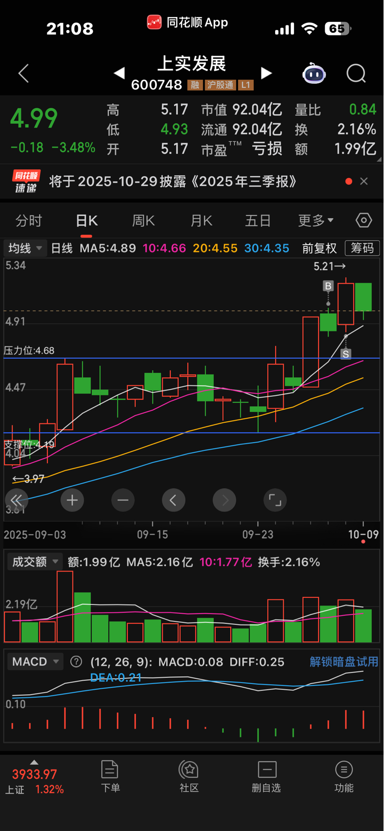 上贴说了耐心等待回踩4.68明确告诉你5.21不是顶明天弱转强也不可能最起码两天