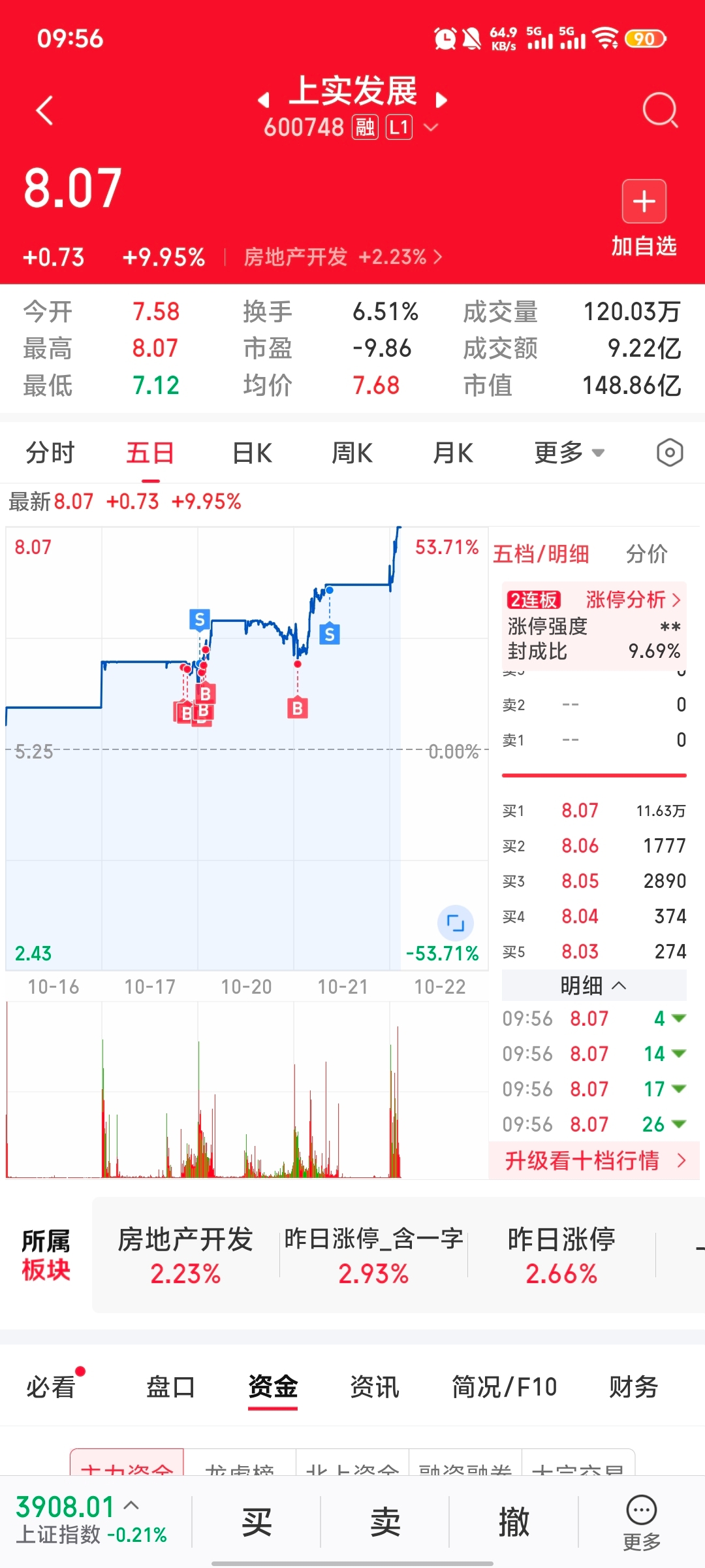 $上实发展(SH600748)$ 昨天板上减仓,今天再减四分之一