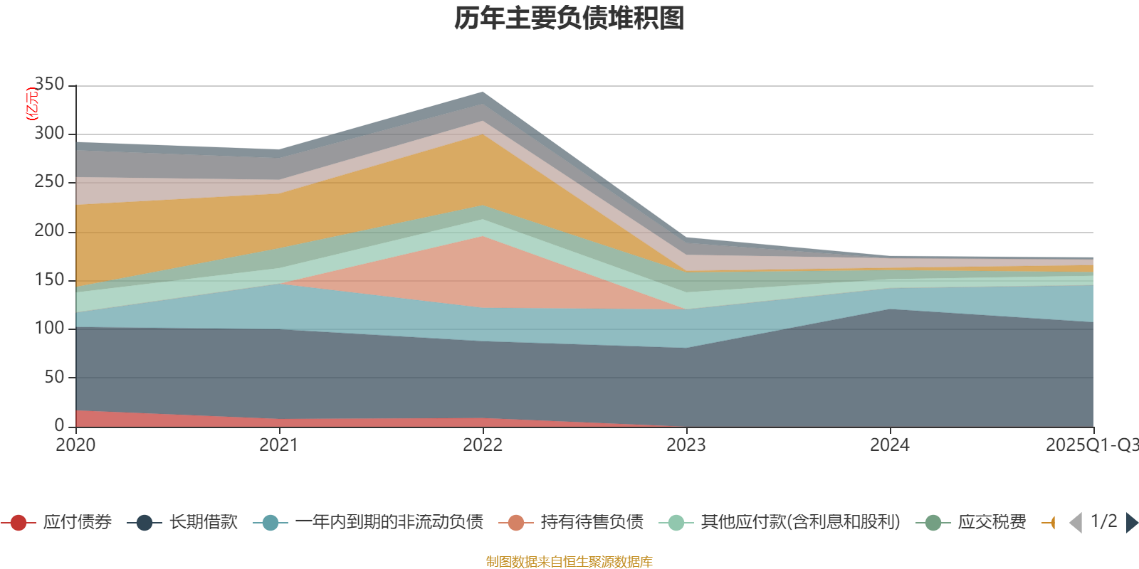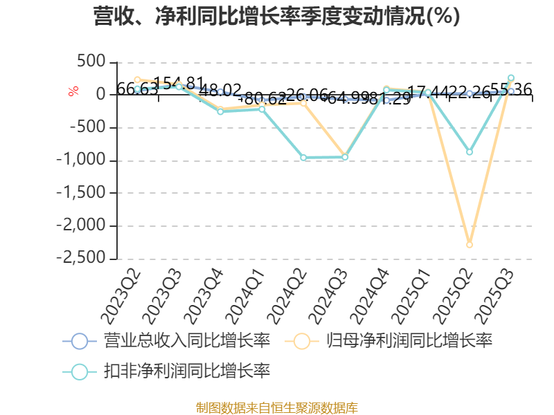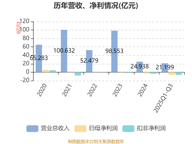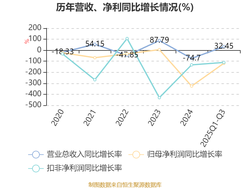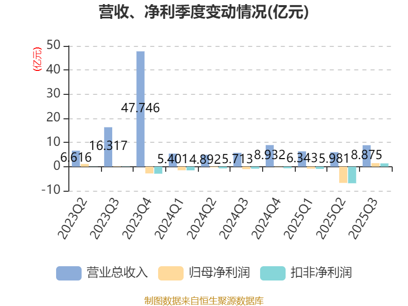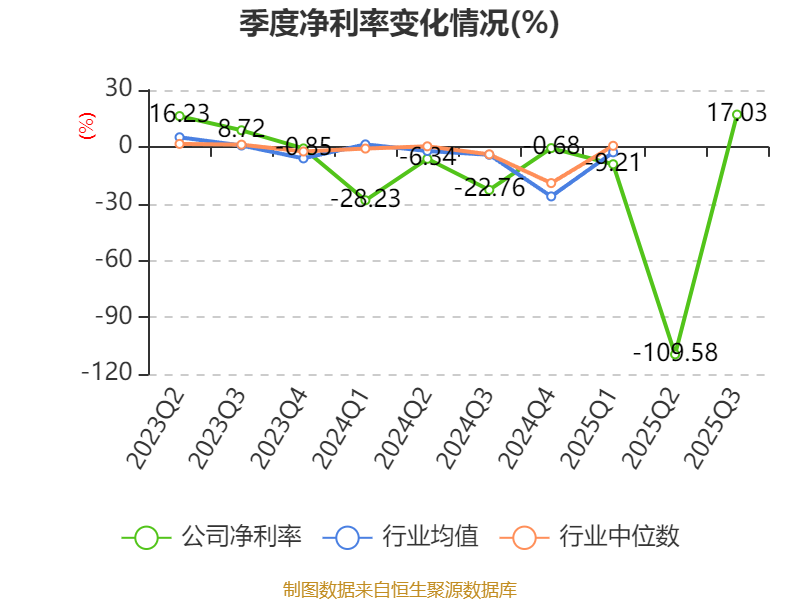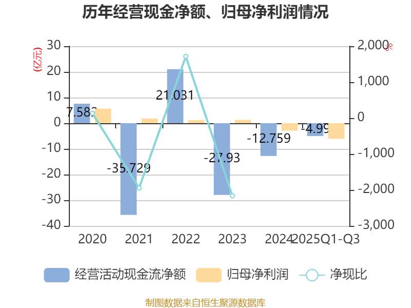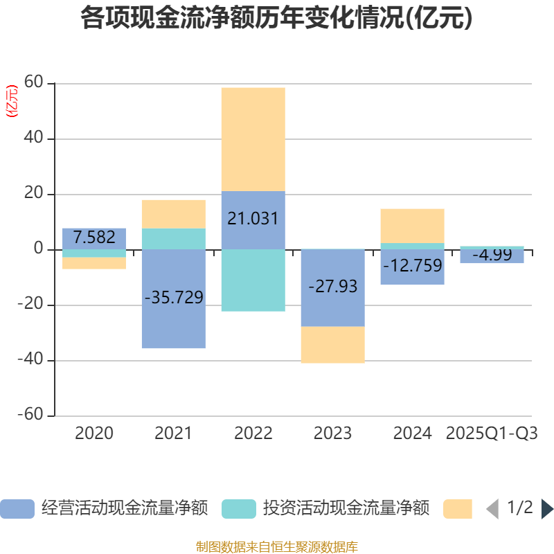 2025年前三季度,公司经营活动现金流净额为-4.99亿元,同比增加11.91亿元;筹资活动现金流净额341.36万元,同比减少3.07亿元;投资活动现金流净额1.11亿元,上年同期为2.22亿元。
