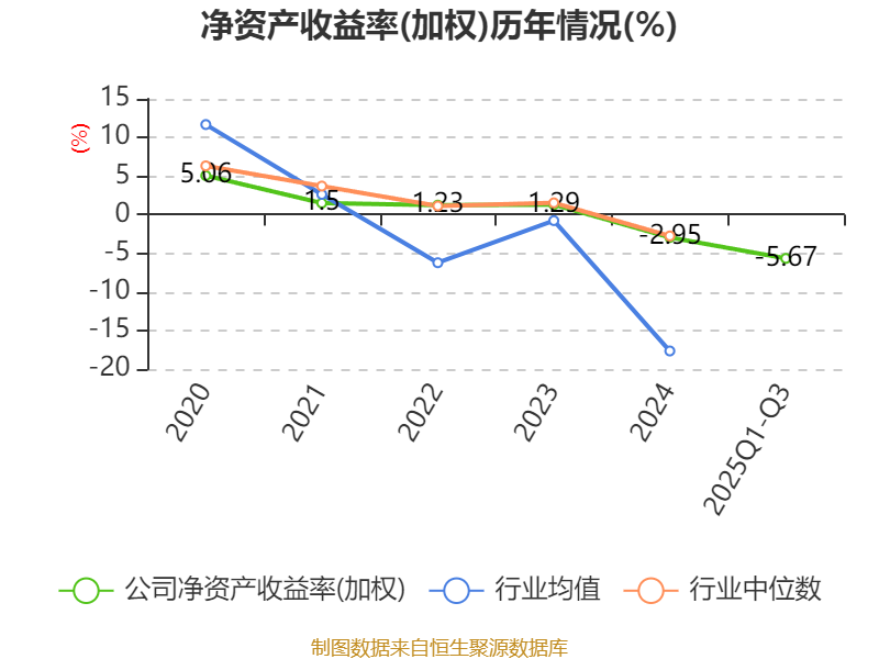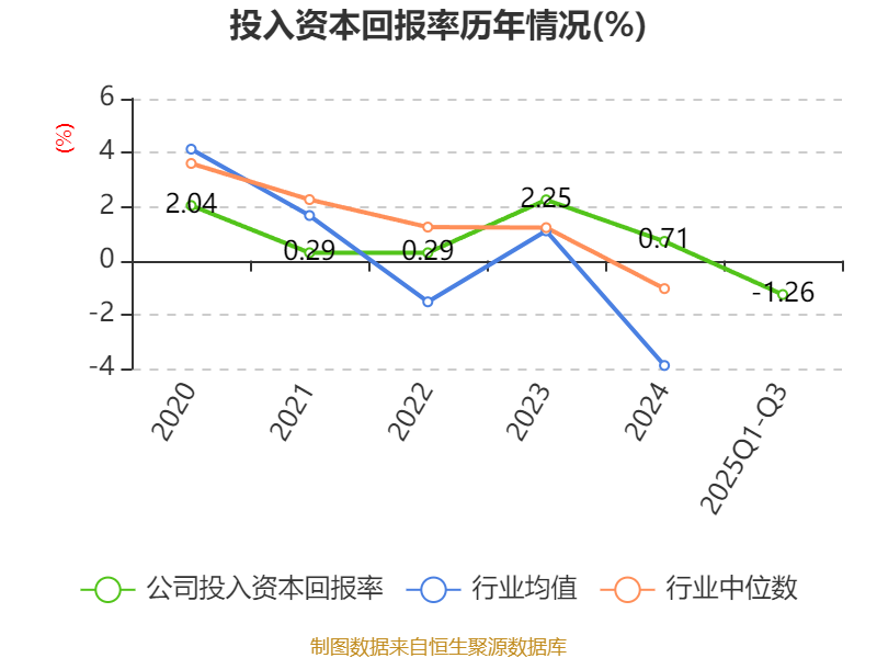 盈利能力方面, 2025年前三季度公司加权平均净资产收益率为-5.67%,同比下降2.85个百分点。公司2025年前三季度投入资本回报率为-1.26%,较上年同期下降1.21个百分点。