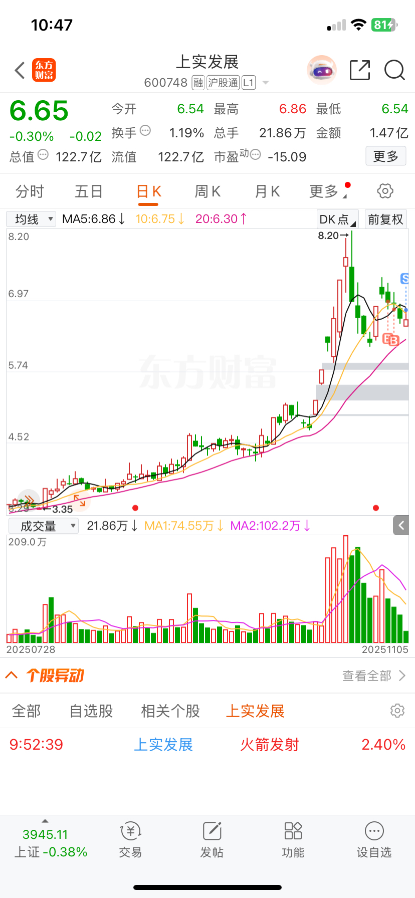 $上实发展(SH600748)$ 拿了4天,今天亏500.出了,都在等消息,主力会不会阴跌下去