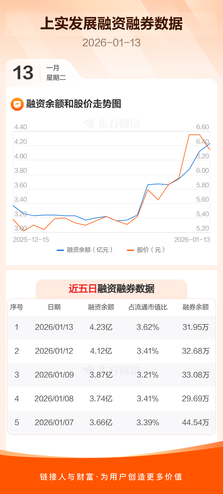 交易所最新数据显示,上实发展于2026年1月13日获融资买入4044.41万元,融资偿还2927.87万元,当日融资净买入1116.55万元。目前,该股融资余额4.23亿,占流通市值比例为3.62%。