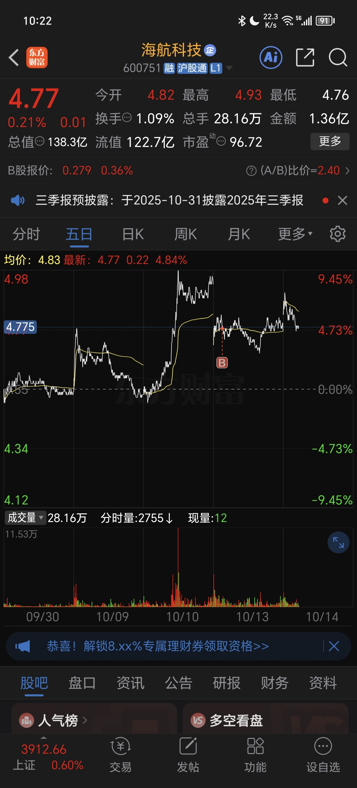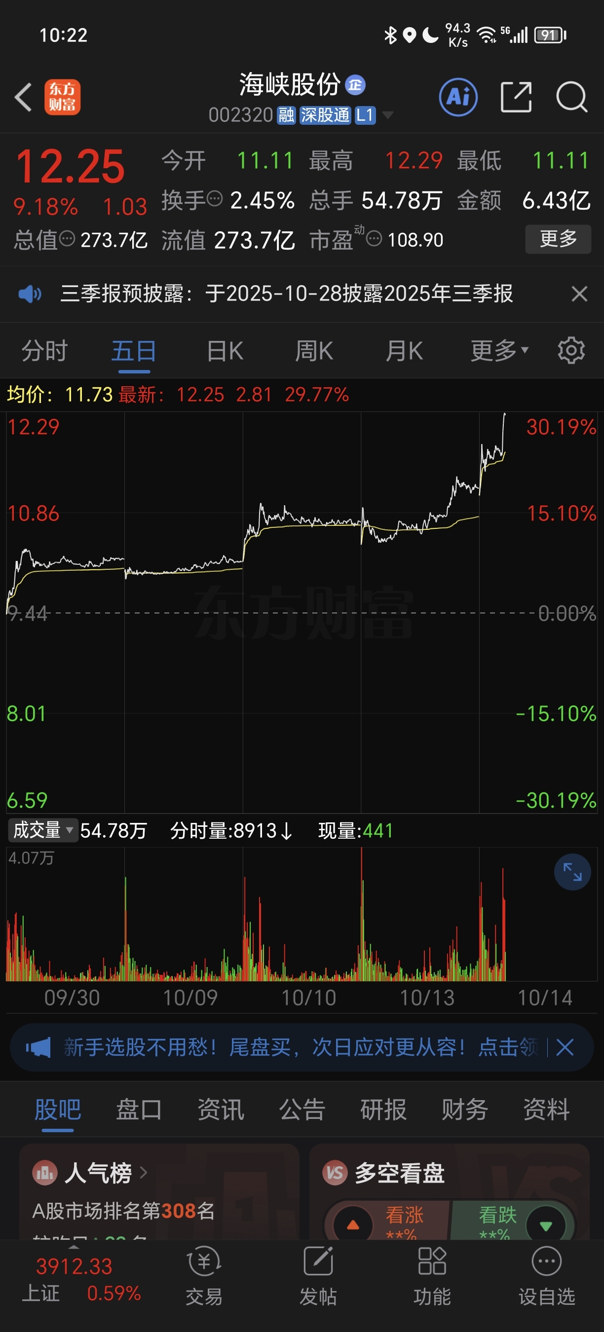 同时关注到海航科技与海峡股份,昨天只进了海航你别让我失望嘛
