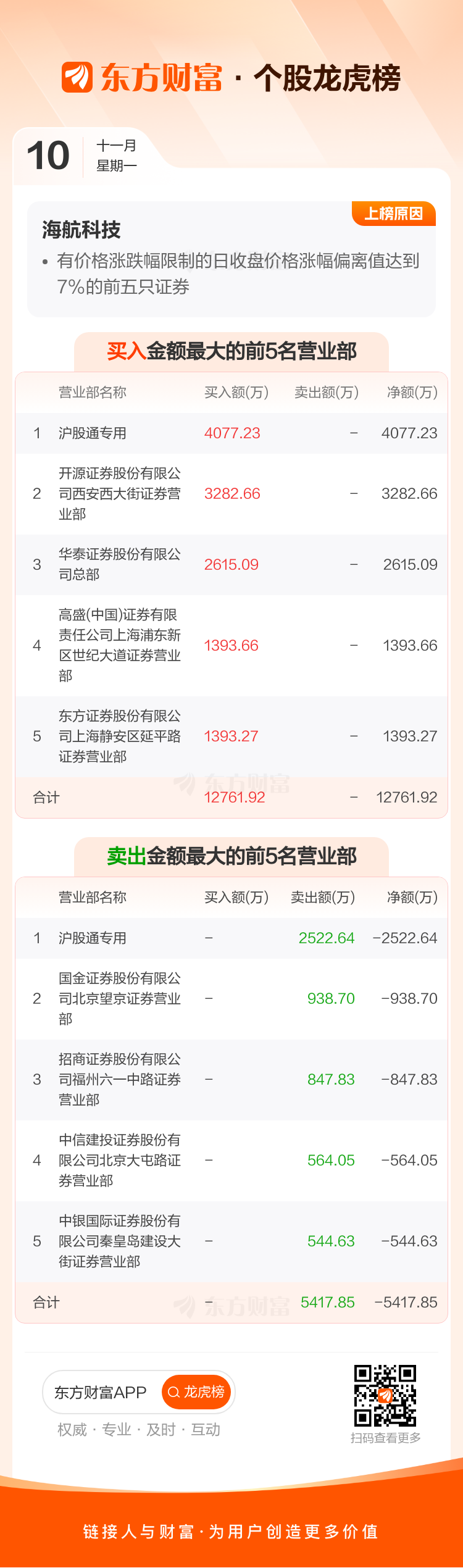 交易所2025年11月10日公布的交易公开信息显示,海航科技因成为有价格涨跌幅限制的日收盘价格涨幅偏离值达到7%的前五只证券上榜。海航科技当日收报4.9元,涨跌幅10.11%,偏离值9.59%,换手率4.37%,成交额5.47亿。
