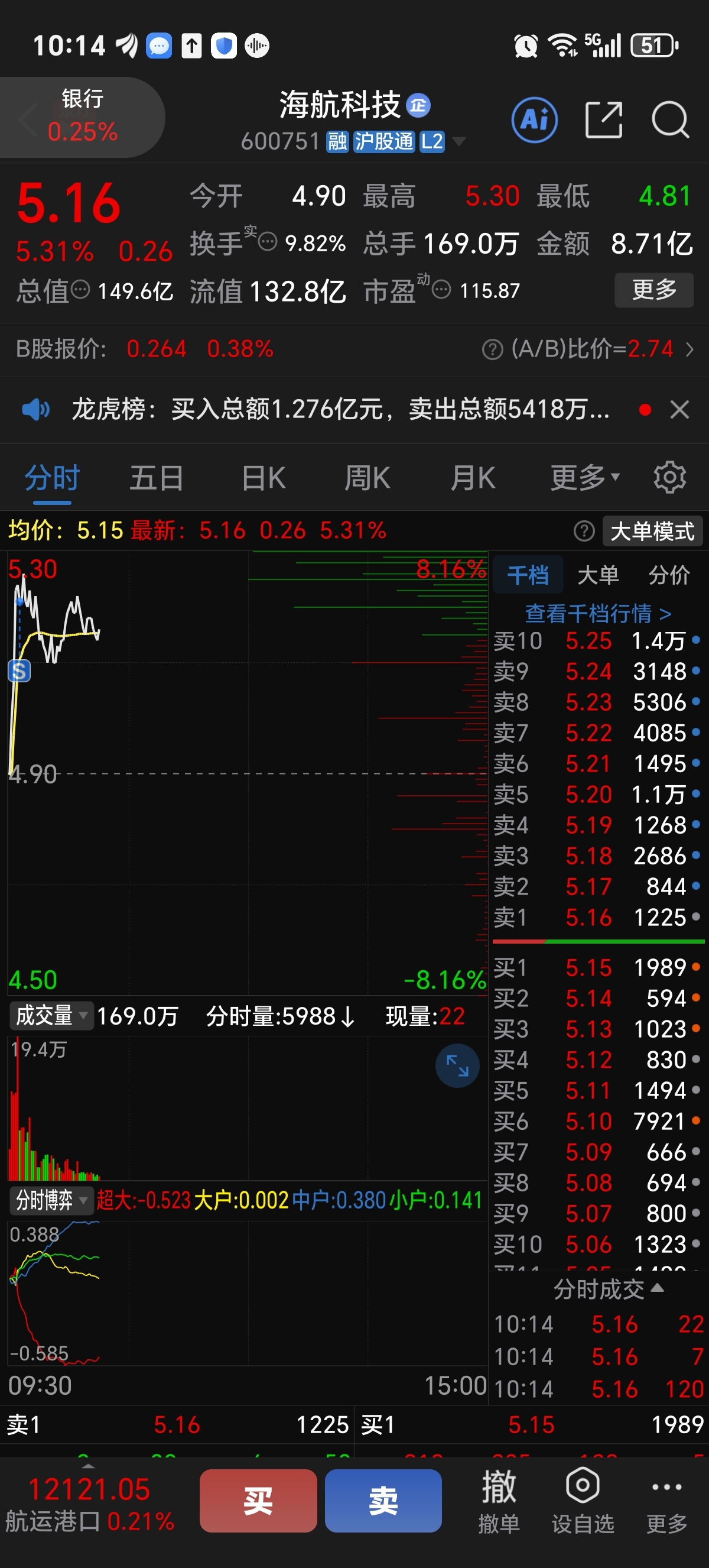 $海航科技(SH600751)$ 高位振荡是想拉升封板吗?