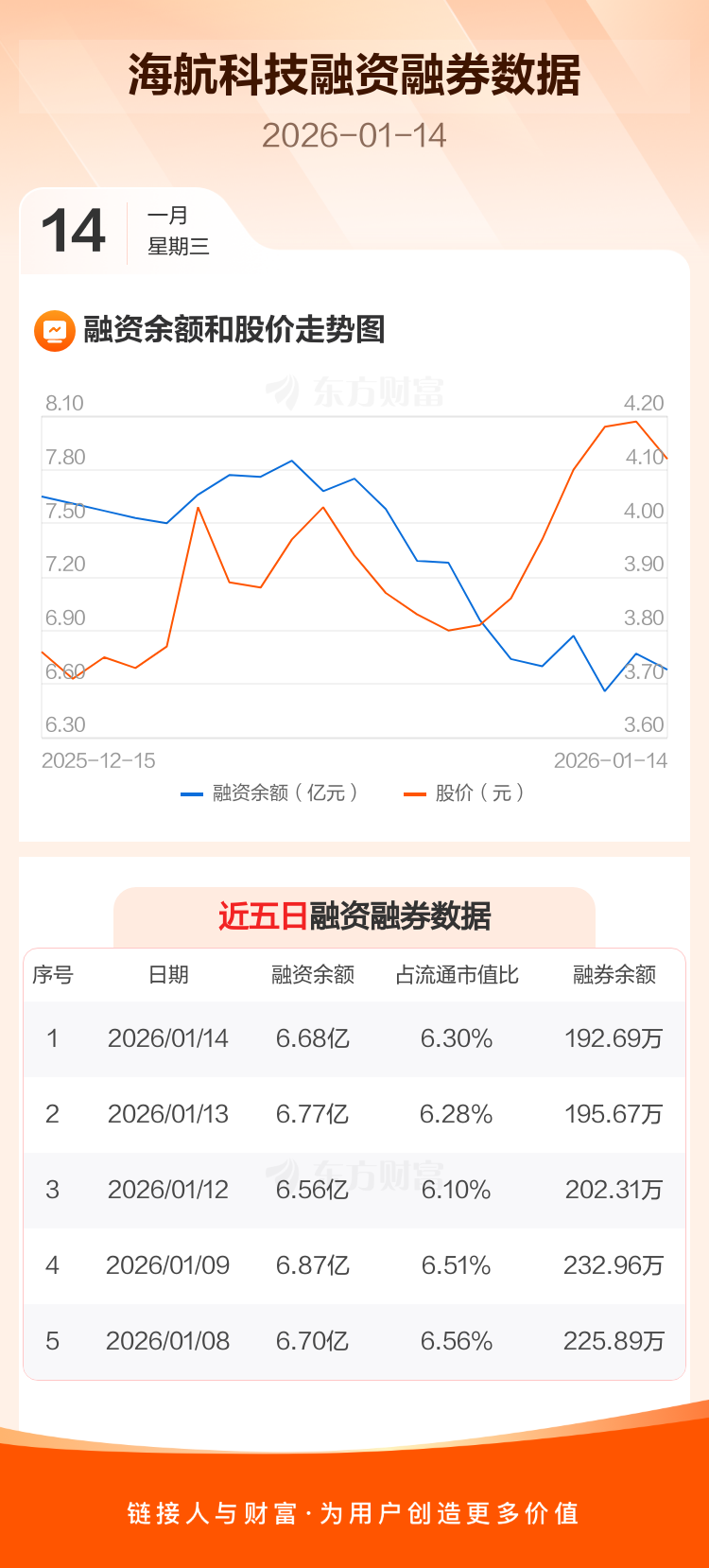 交易所最新数据显示,海航科技于2026年1月14日获融资买入2452.92万元,融资偿还3419.11万元,当日融资净偿还966.19万元。目前,该股融资余额6.68亿,占流通市值比例为6.30%。