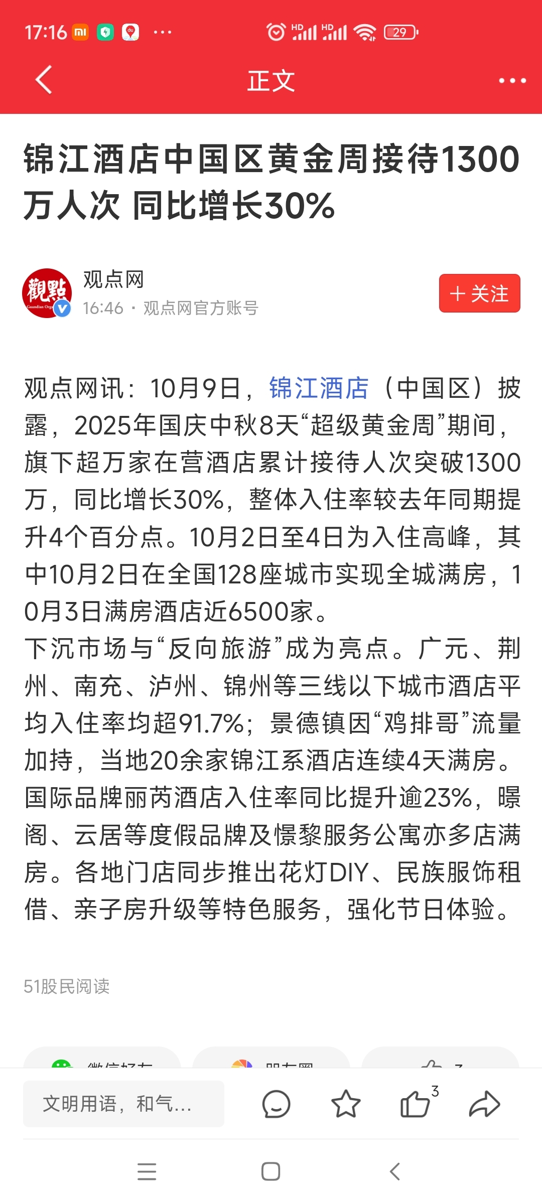 $锦江酒店(SH600754)$ 满全程满客房。