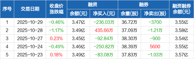 融资方面,当日融资买入1491.74万元,融资偿还1727.77万元,融资净偿还236.03万元。融券方面,融券卖出400股,融券偿还4100股,融券余量36.72万股,融券余额801.96万元。融资融券余额合计3.55亿元。