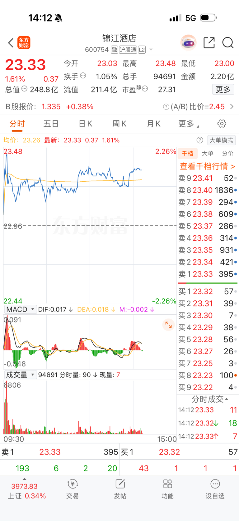 $锦江酒店(SH600754)$ 看五十档,上面差不多有五万手卖单等着散户解放