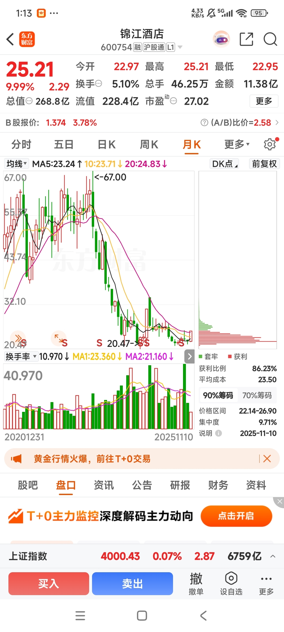 坚持了一年多第一次涨停起飞,拿稳明天应该还有个涨停板,锦江酒店还在底部