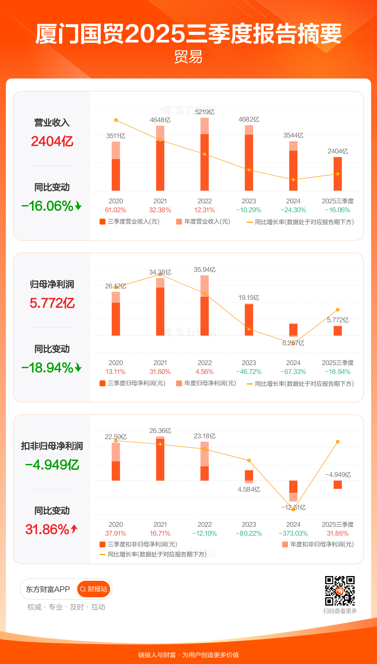厦门国贸10月31日发布2025年三季报显示,公司前三季实现营业收入2403.52亿元,同比下滑16.06%;归母净利润5.77亿元,同比下滑18.94%;扣非归母净利润-4.95亿元。