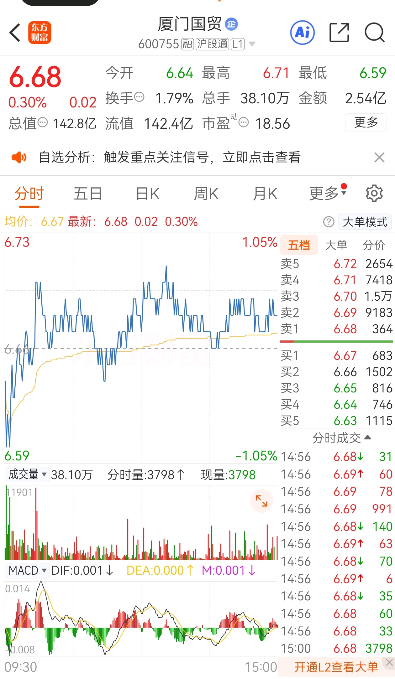 $厦门国贸(SH600755)$ 分时线灵动起伏藏向上韧性,成交柱红绿交织活力满,MACD 悄然蓄力,是“厚积待发”征兆,当前价位稳扎稳打,如牢固地基,后续上升空间明朗。 走势稳进显底气,成交活跃聚人气,指标联动藏契机。扎实盘面像攒劲种子,待到春风催繁花,收益自然顶呱呱。