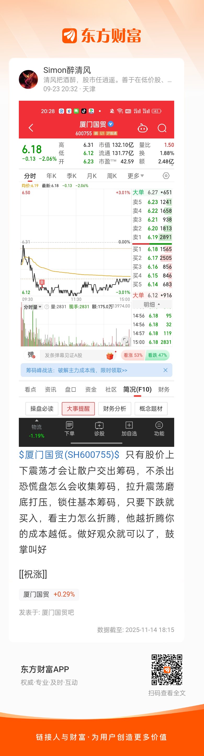 $厦门国贸(SH600755)$ 只有股价上下震荡才会让散户交出筹码,不杀出恐慌盘怎么会收集筹码,拉升震荡磨底打压,锁住基本筹码,只要下跌就买入,看主力怎么折腾,他越折腾你的成本越低。做好观众就可以了,鼓掌叫好