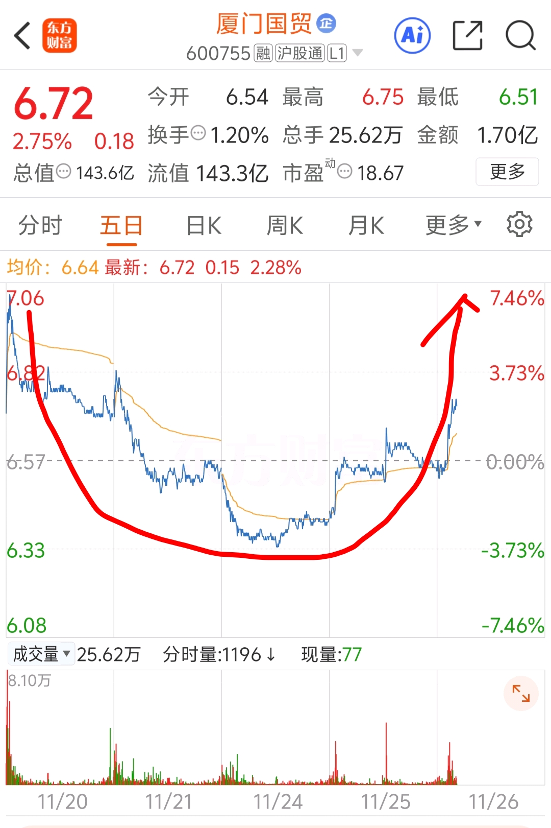 五天来个圆弧底,这样的图形是非常漂亮的,难道真的来行情了有点不敢相信