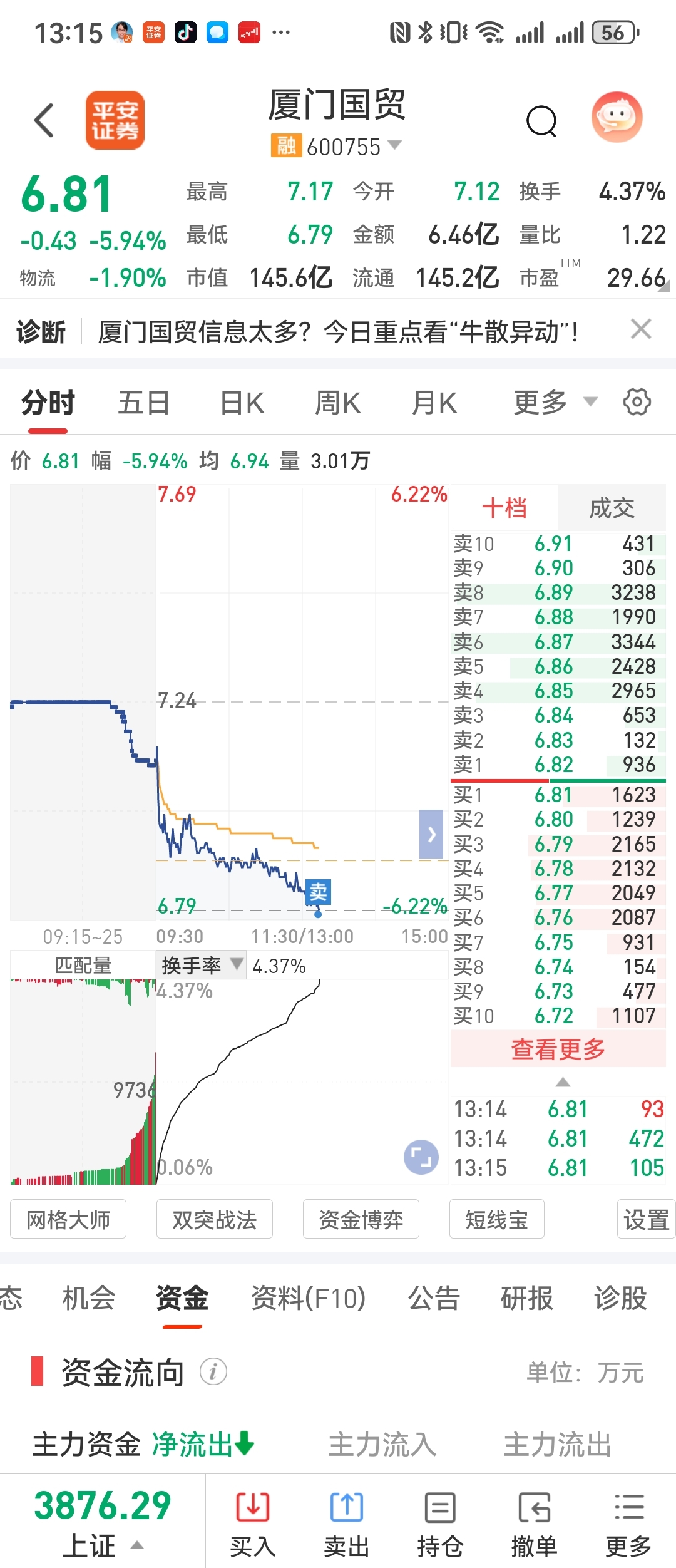 $厦门国贸(SH600755)$ 25万多股,拿了7天亏4万割肉离场,你们玩吧