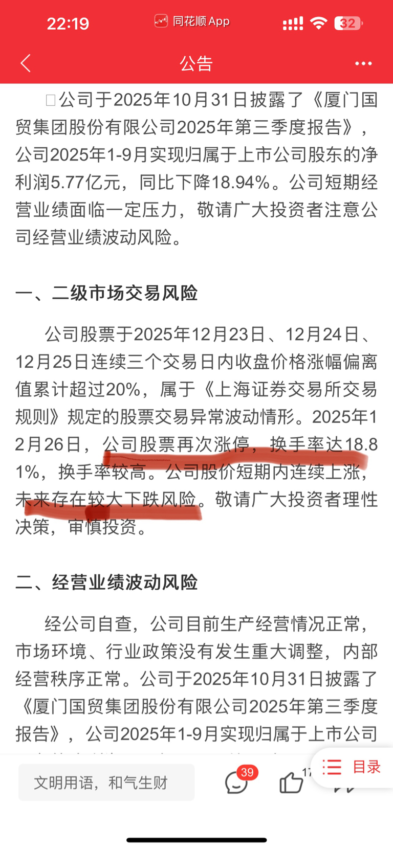 $厦门国贸(SH600755)$ 对比下今天6板的大业的公告,大家看一看用词,大家炒股不是一天两天,3倍5倍的我见过用词比较严重导致第二天跌的也就是击鼓传花了,但是国贸3板就来一句,未来存在较大下跌风险,这是正常风险提示?