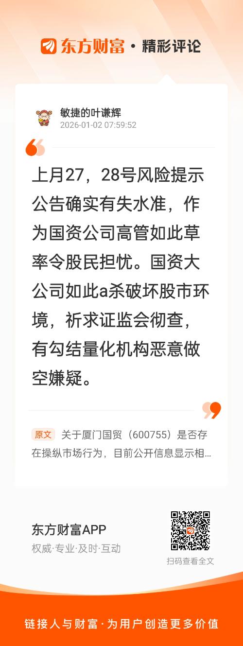 上月27,28号风险提示公告确实有失水准,作为国资公司高管如此草率令股民担忧。国资大公司如此a杀破坏股市环境,祈求证监会彻查,有勾结量化机构恶意做空嫌疑。 我在《关于厦门国贸(600755)是否存在操纵市场行为,目前公开信息显示相关指控主要源》的评论获得了大家的关注。