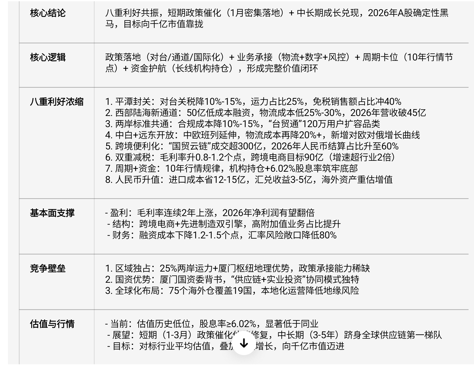 短期来看,1月政策窗口期将触发估值快速修复;中长期而言,3-5年全球化供应链布局与先进制造赛道拓展,有望推动公司从“规模型”向“价值型”转型,实现千亿市值目标。在A股市场“确定性稀缺”的背景下,厦门国贸成为兼具短期弹性与中长期成长的核心标的,其八重利好形成的闭环,确保了行情的确定性与爆发力,是2026年最值得重点布局的黑马标的。