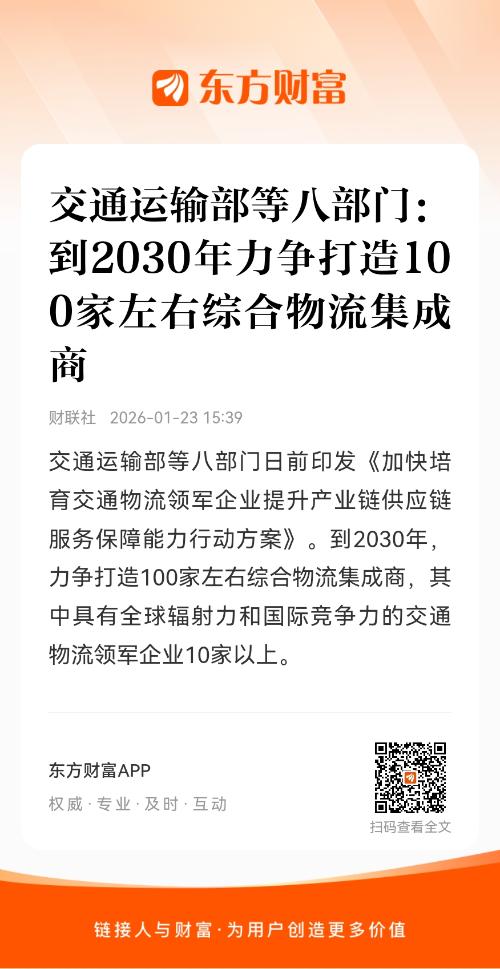 交通运输部等八部门日前印发《加快培育交通物流领军企业 提升产业链供应链服务保障能力行动方案》,支持交通物流领军企业拓展服务网络、提升全链条一体化交通物流服务能力、深化与产业链供应链融合发展、加速交通物流数智化赋能、增强交通物流安全韧性。到2030年,力争打造100家左右综合物流集成商,其中具有全球辐射力和国际竞争力的交通物流领军企业10家以上。