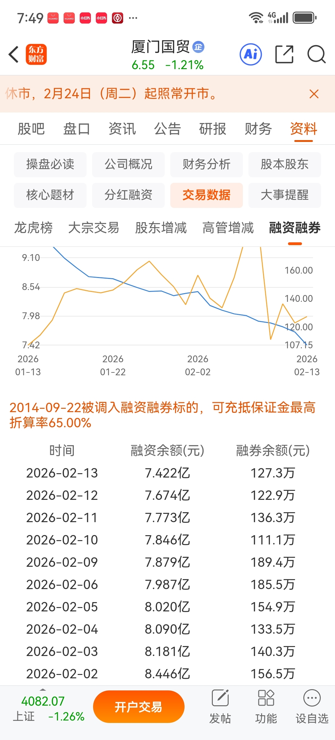 $厦门国贸(SH600755)$ 融资盘从五号的8亿到今天的7.4亿。抛了6个多亿,正好2000万砸1.5个点。真实的成交有多少,这下知道了吧,融资盘还有7.4亿,还早呢。2000万都没有啥承接。年后继续看空