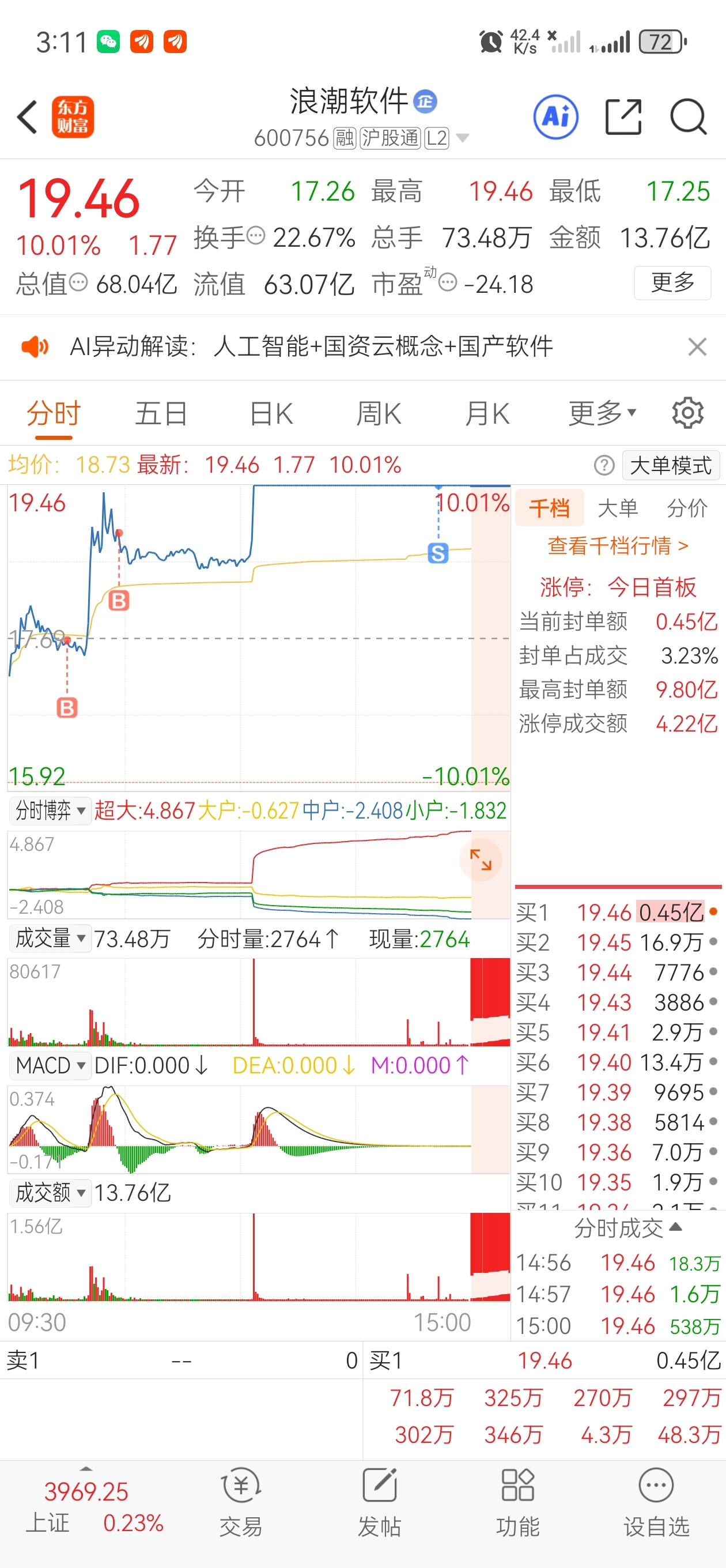 $浪潮软件(SH600756)$ 这个票没有连板本事,还是卖了比较稳定,拜拜了