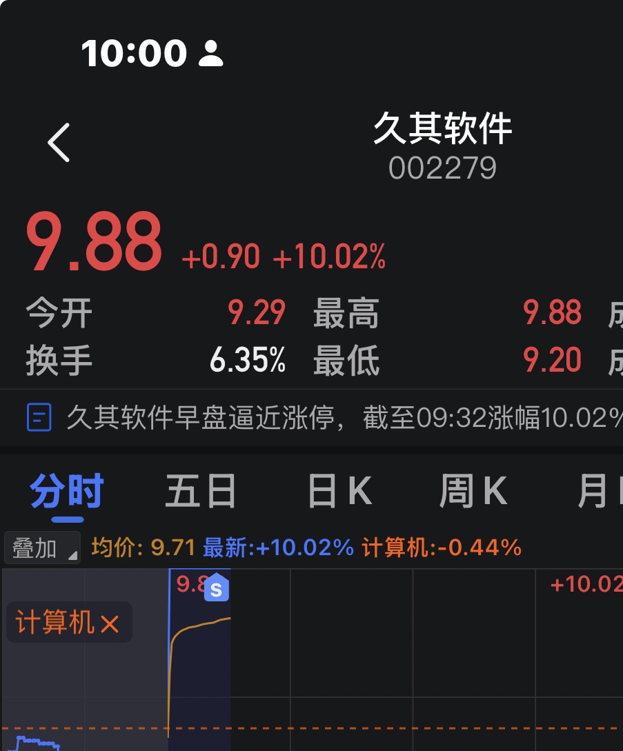 久其软件:我昨天进入,今天涨停!浪潮软件今天会疲软一段时间,因为资金都去了久其软件,我昨天也去了,买了不少筹码,今天的心情非常好,久其软件涨停了,早盘直接封板!卖出了半仓,多指收益,不能太贪了!附久其软件涨停价卖出的交割图: