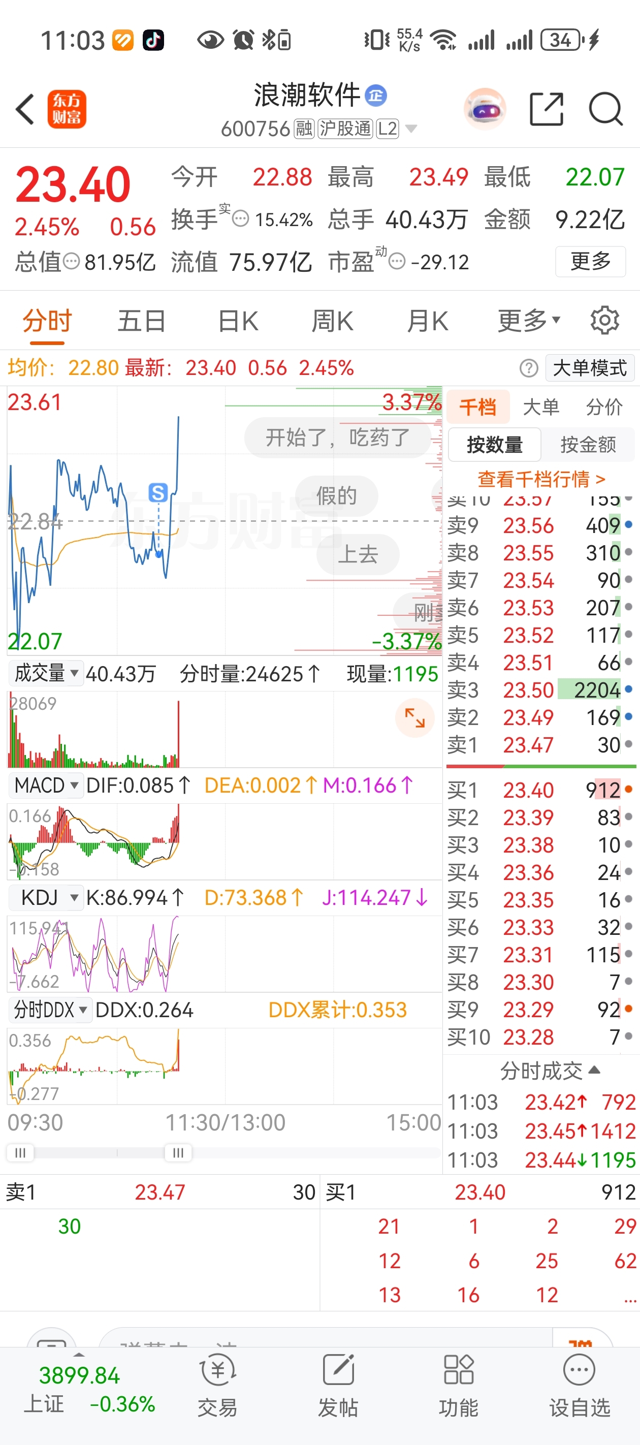 $浪潮软件(SH600756)$ 服了,刚卖就拉,创新低,无量拉升,跌破分时均线卖了,软件跳水,这卖错了?