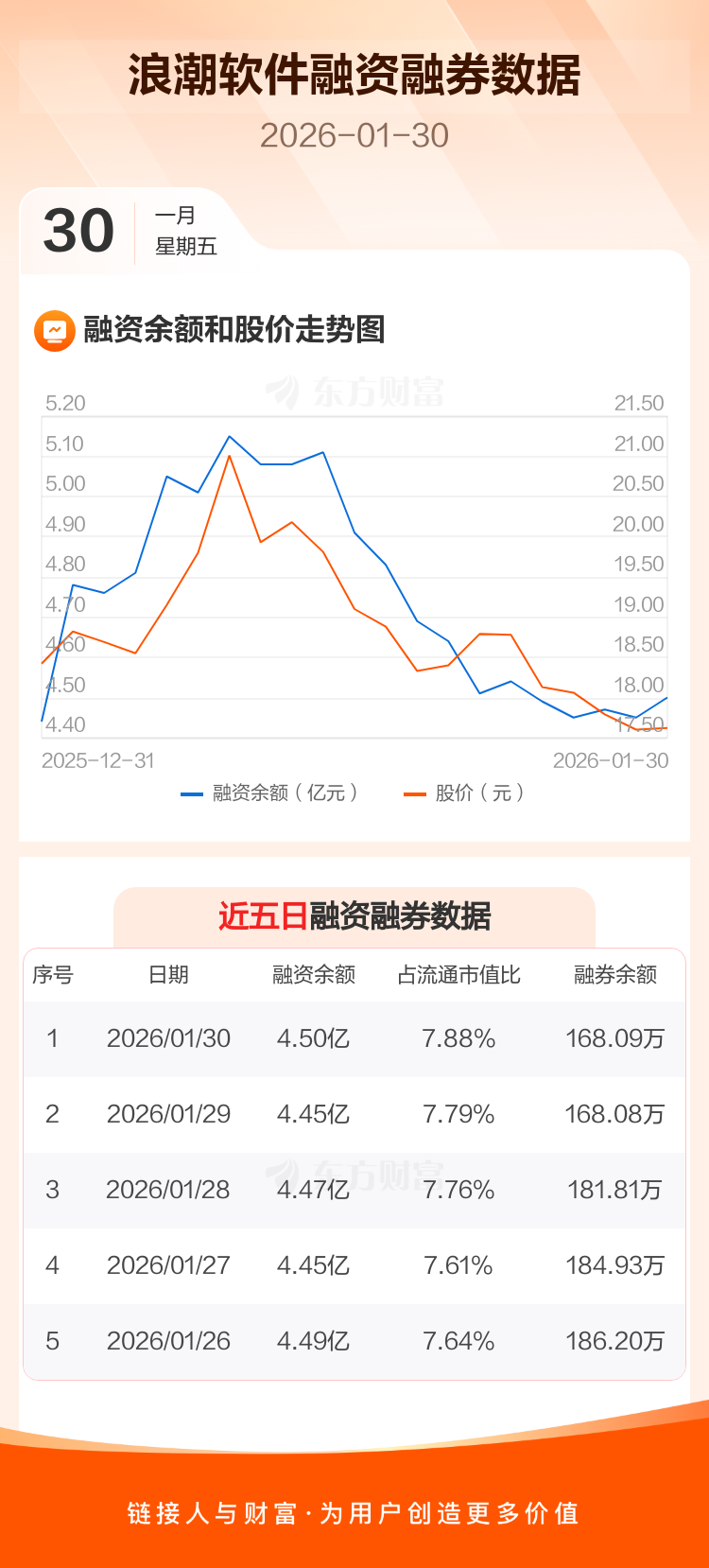 交易所最新数据显示,浪潮软件于2026年1月30日获融资买入2437.49万元,融资偿还1870.53万元,当日融资净买入566.97万元。目前,该股融资余额4.50亿,占流通市值比例为7.88%。