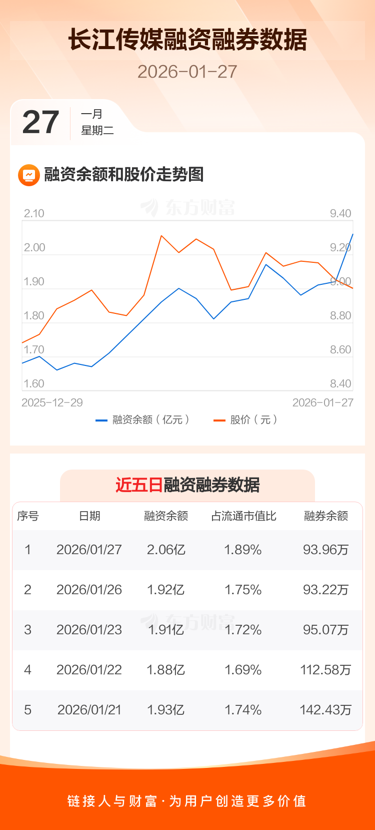交易所最新数据显示,长江传媒于2026年1月27日获融资买入2378.25万元,融资偿还1017.88万元,当日融资净买入1360.37万元。目前,该股融资余额2.06亿,占流通市值比例为1.89%。