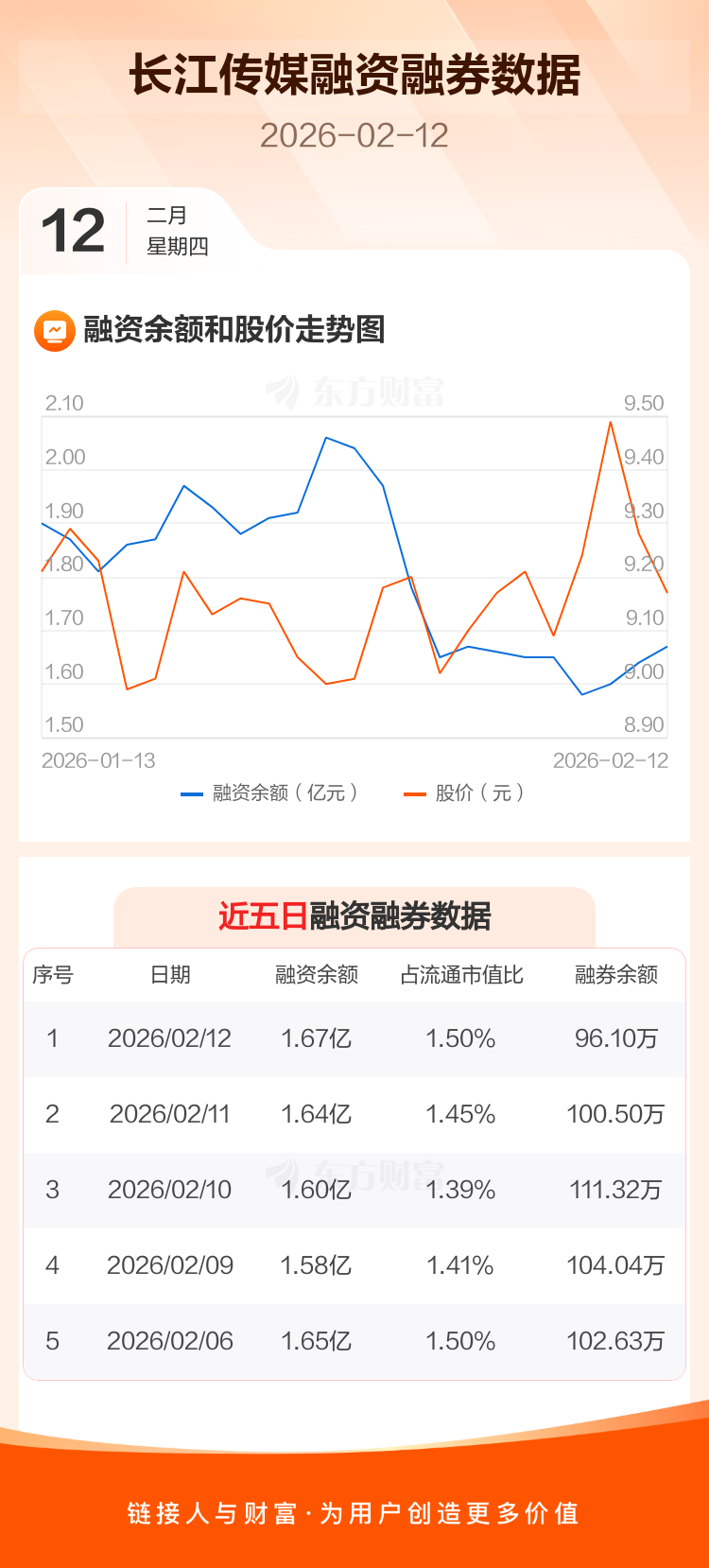 交易所最新数据显示,长江传媒于2026年2月12日获融资买入1658.14万元,融资偿还1365.42万元,当日融资净买入292.72万元。目前,该股融资余额1.67亿,占流通市值比例为1.50%。