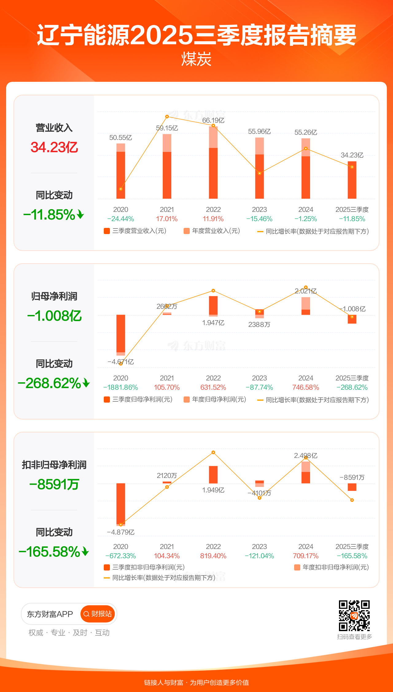 辽宁能源10月31日发布2025年三季报显示,公司前三季实现营业收入34.23亿元,同比下滑11.85%;归母净利润-1.01亿元;扣非归母净利润-8591.28万元。