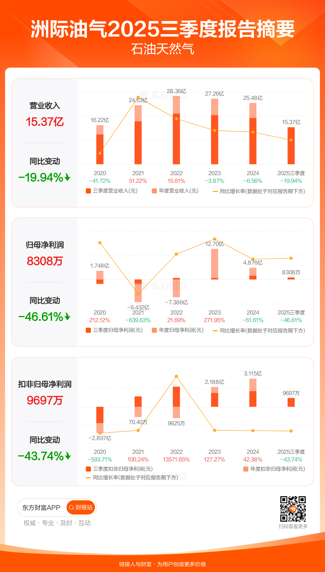 洲际油气10月31日发布2025年三季报显示,公司前三季实现营业收入15.37亿元,同比下滑19.94%;归母净利润8307.61万元,同比下滑46.61%;扣非归母净利润9697.00万元,同比下滑43.74%。