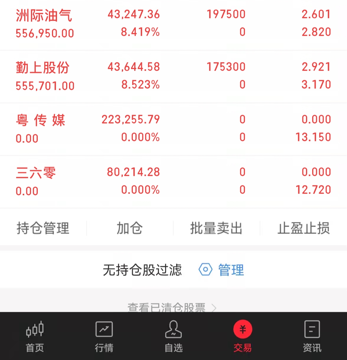 4、炒股要分仓操作。普通股民最喜欢一次性进场和满仓,因为图方便,但却不知道这无形中就加大了失败的风险。进场不可能每次都是合适的位置,因此要懂得分批进。比如我持仓个股是3-5只,其中单一个股仓位不会超过总仓位的1/5这个上限值,而我仓位最多时是八层仓,再往上一般不会轻易加,留着的仓位是应急的。然后进票时,我也会分两到三次进,不会一次进完。详细的分仓思路昨天也写了。