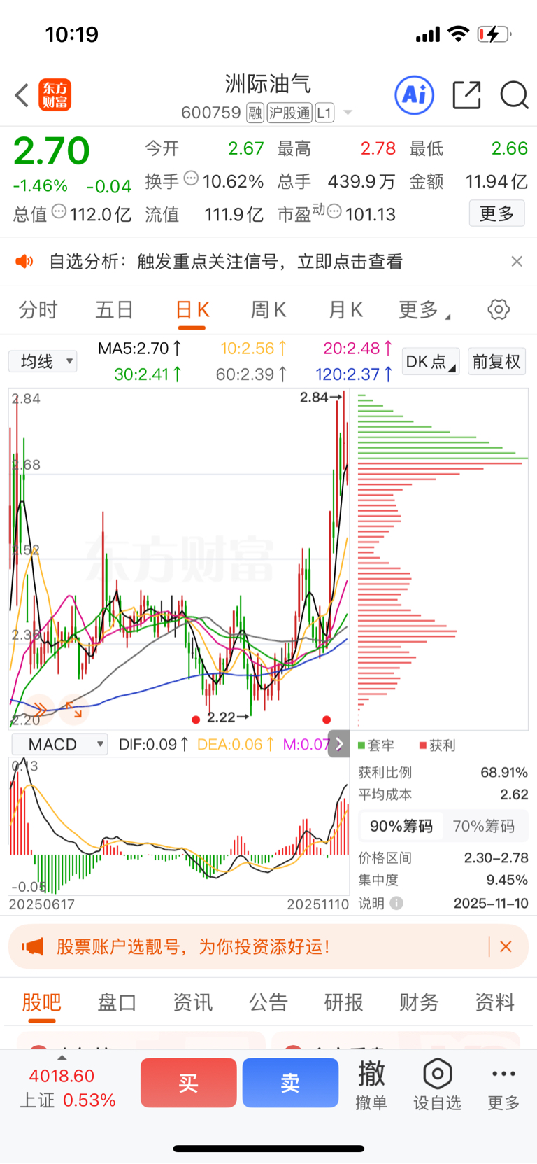 $洲际油气(SH600759)$ 如果明天涨停就完全打开上涨空间,破点前面高点压力位2.83就奔20块去才有压力了。如果回落,那就要相向下大幅调整
