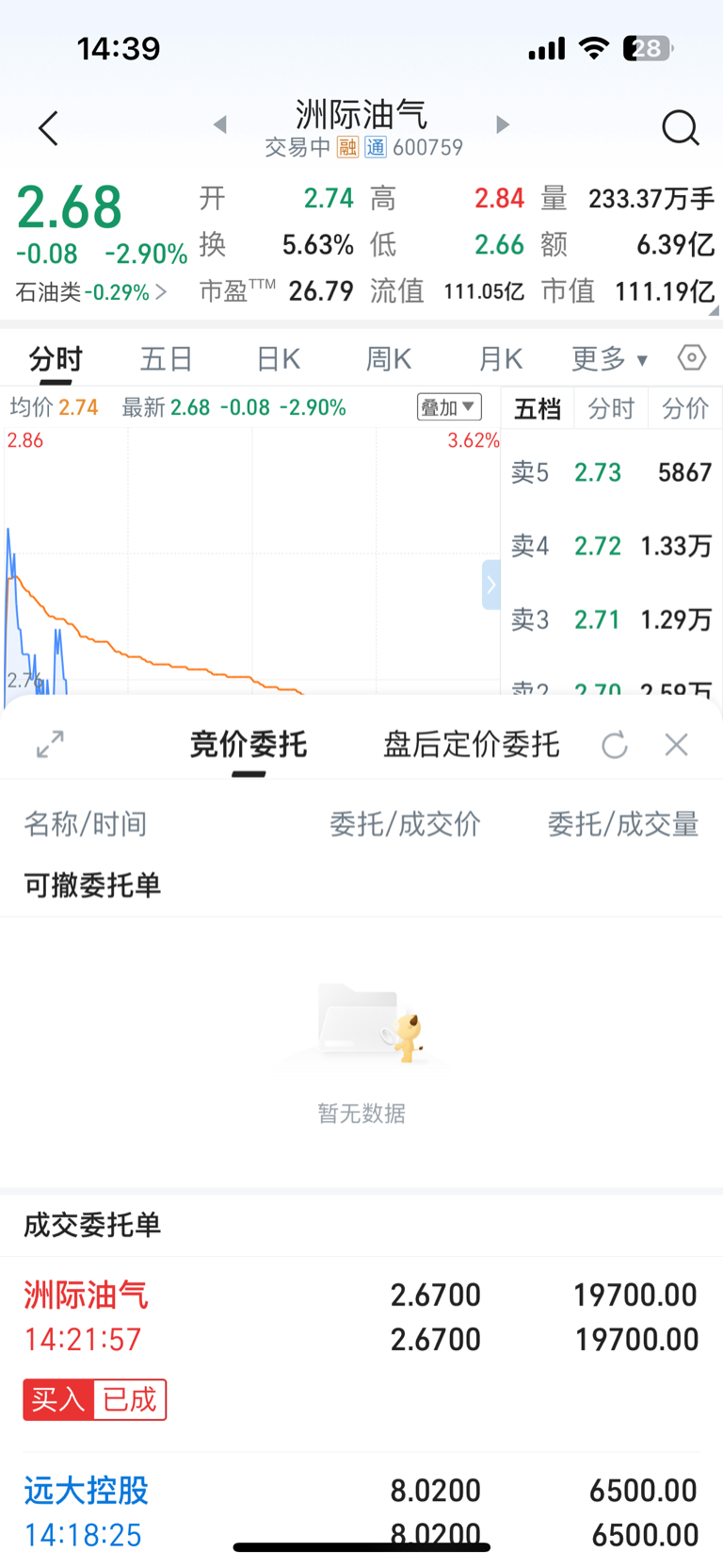 $洲际油气(SH600759)$ 2.76卖出,2.67接回。小吃一口