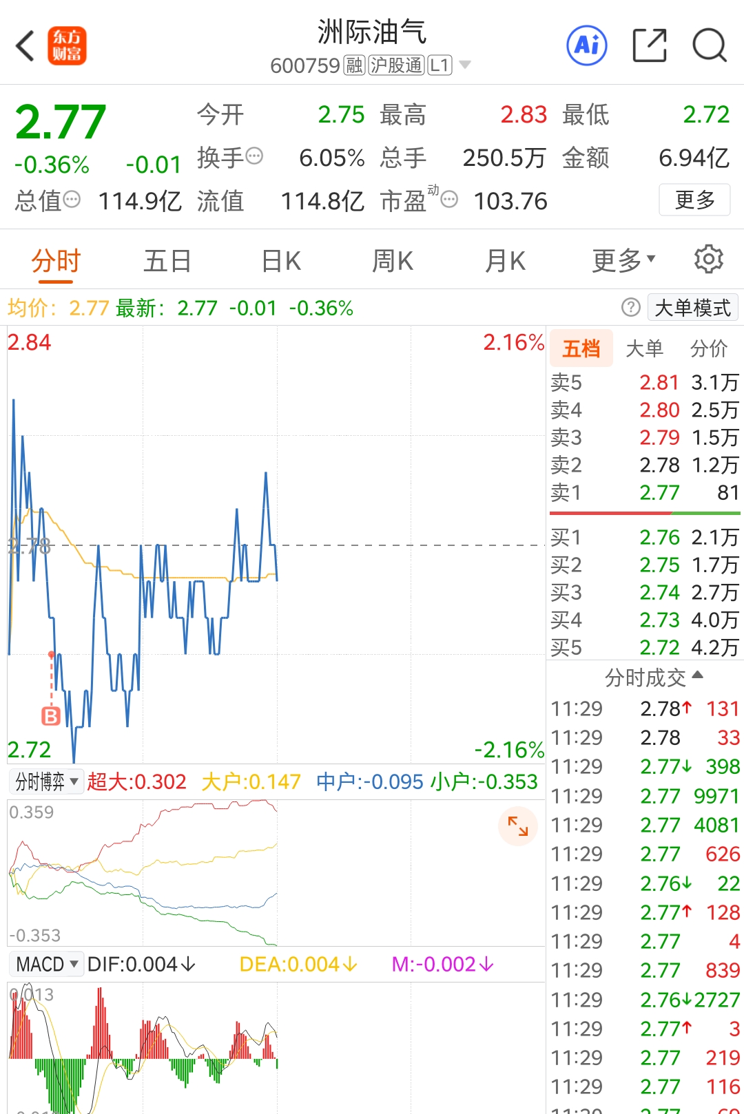 $洲际油气(SH600759)$ 上午成交后挂单猜设2.88 走,等下午的盘面,因看到开盘有量,收盘预感有涨。中午先吃个青菜鱿鱼面。等看下午绿转红。