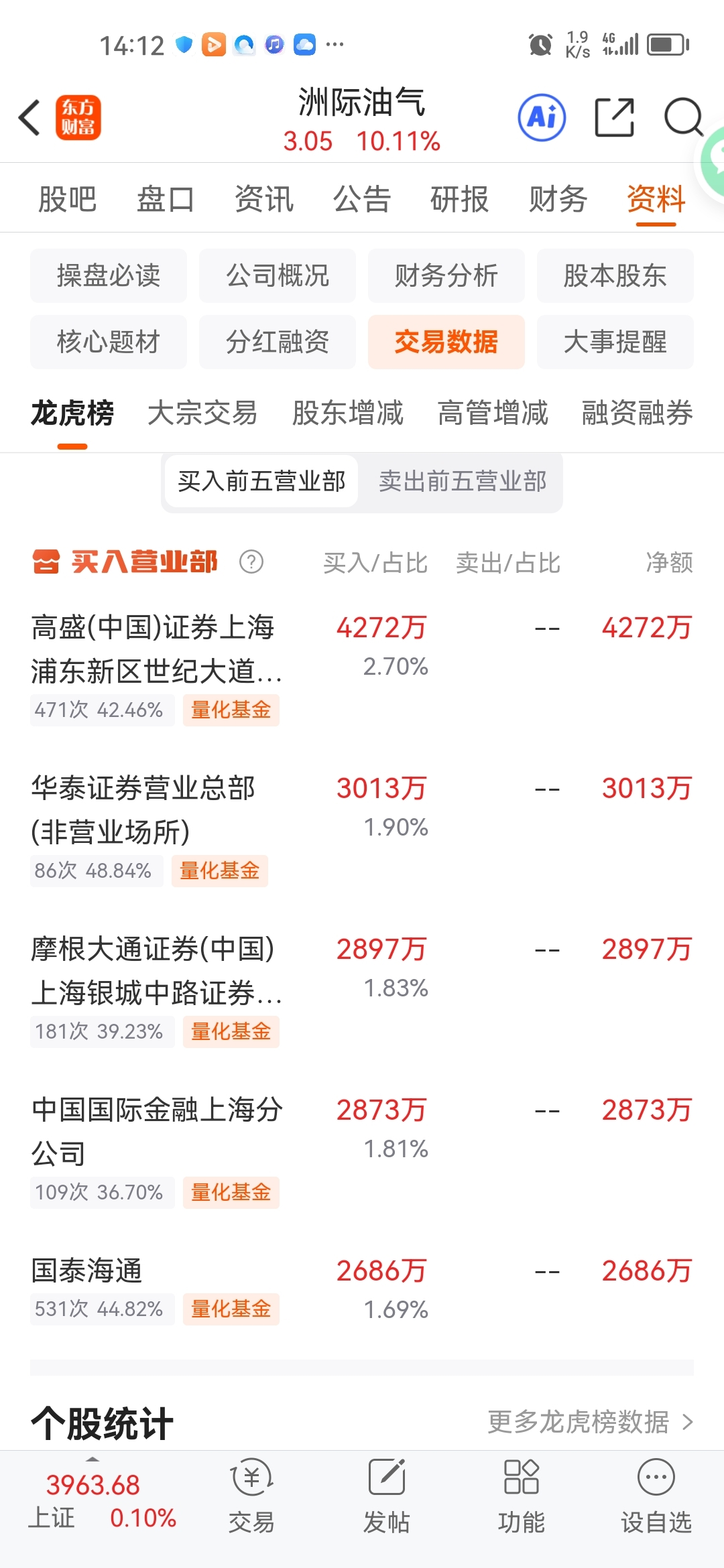 $洲际油气(SH600759)$ 这量化就有点夸张啦,我看了一下其他上榜的龙头,都没有这么多量化资金
