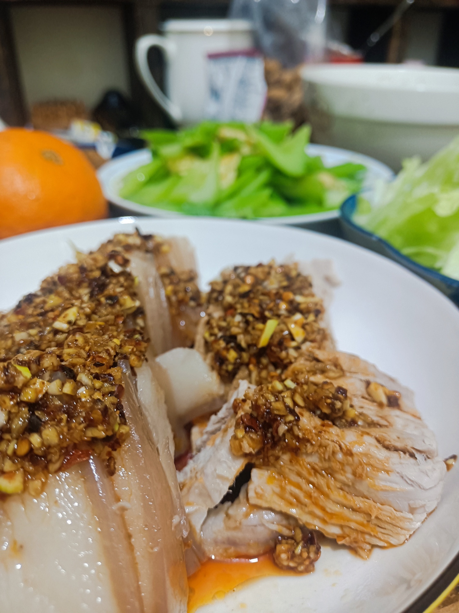 吃了没?农村的土猪肉包生菜,在喝二两。爽