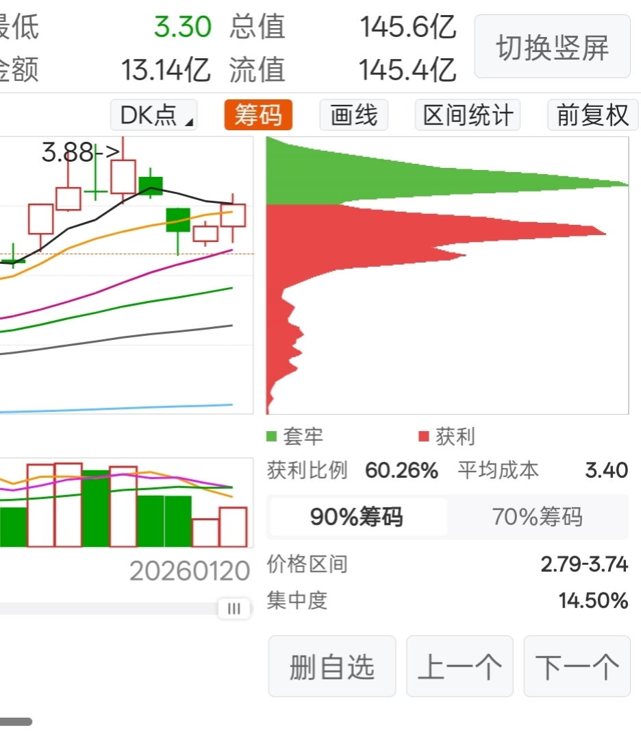 $洲际油气(SH600759)$ 价格就打到这两个筹码峰的颈部,不上攻解套被套筹码,真正的大主力肯定是2块多收集了很多筹码,3.7-3.8出了不少,成本肯定在这两个筹码峰下面,主力进可攻退可守,等待消息面,主力也考虑拉更高会不会有人来接盘,庄家永远不会丢失控盘的筹码