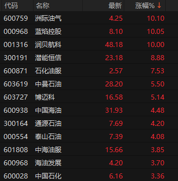 A股油气板块早盘领涨,申万石油石化指数半日涨超2%,洲际油气、蓝焰控股、润贝航科涨停,潜能恒信、石化油服、中曼石油等跟涨,中国海油涨超4%,中国石化涨超3%。